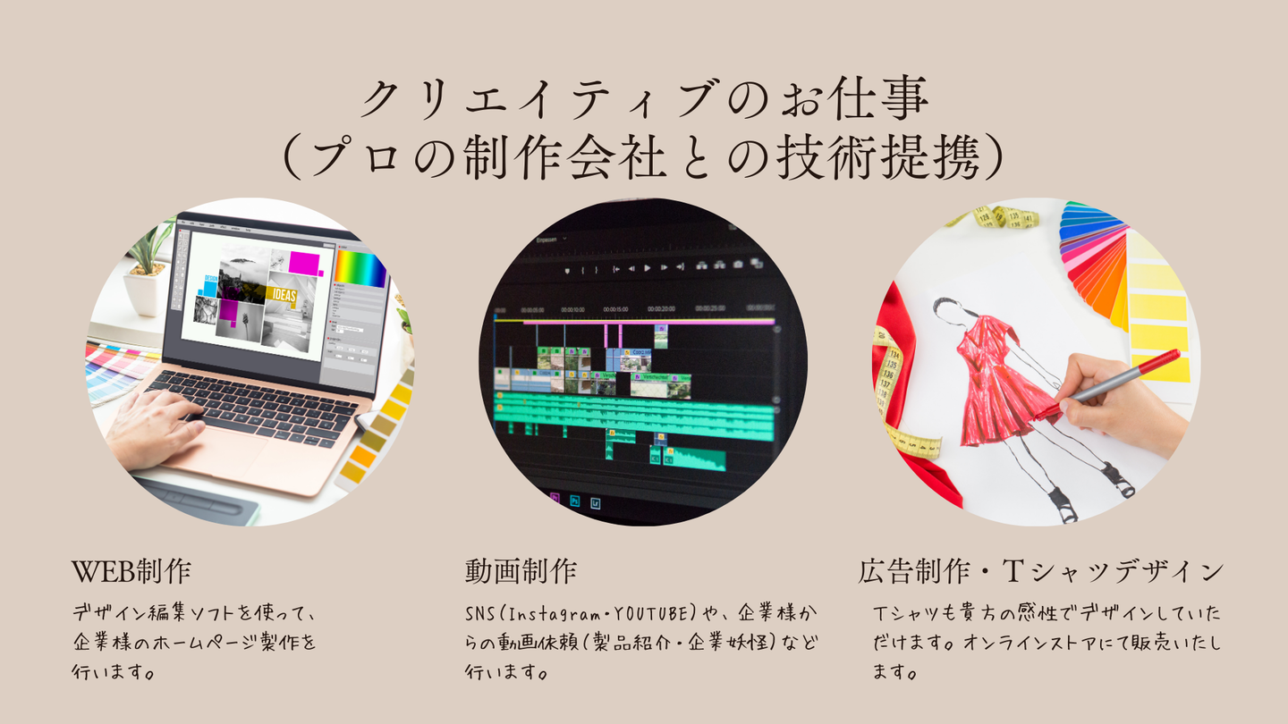 WEB制作、動画制作、ポスター・チラシ制作。SNS運用代行や、オンラインショップの運営まで。